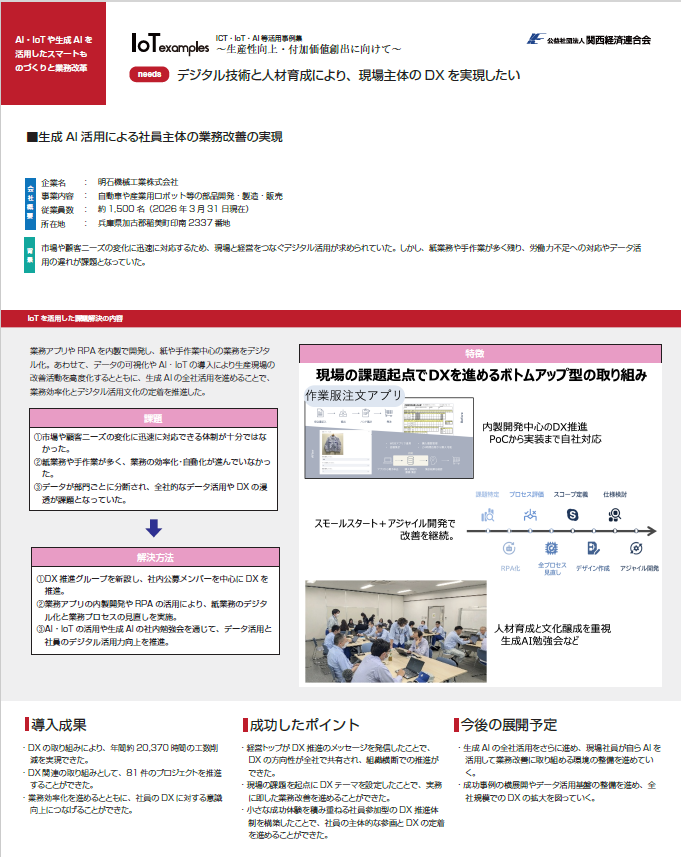 「関西経済連合会」にDXの取り組みが掲載されました 2026/04/17 お知らせ 弊社のDXに関する取り組みが、「関西経済連合会」のWEBサイトに掲載されました。 掲載内容について詳細はこちら 弊社のDX推進につきまして、ホームページモノづくりとDXに掲載しております。 今後もデジタル技術を活用し、持続的な成長と企業価値の向上に取り組んでまいります。 投稿ナビゲーション 前のお知らせを表示する GW休暇のお知らせ
